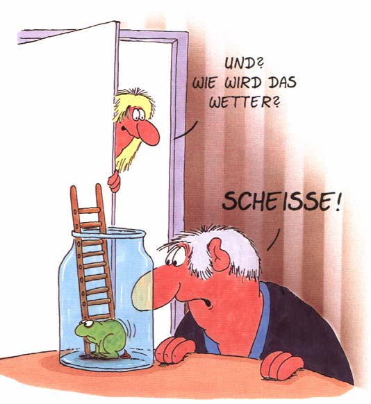 Herr Kresl hat ein problem, denn sein bestes Stück ist einfach zu lang. So hört er von einem Gerücht im Dorf, das im See hinterm Dorf ein Zauberfrosch lebt. Wenn man ihm fragt, ob er einen heiraten will und er nein sagt, dann wird der Schwanz um 10 Zentimeter kleiner. Er kann sich das leisten, da sein bester 50 cm groß ist. So macht er sich auf den Weg zu dem See. Nachdem er den Frosch gefunden hatte, fragte er ihm: "Lieber Frosch, willst du micht heiraten?" Der Frosch angeäkelt: Neiin. Dem Herrn Kresl ist er aber noch immer zu lange, so fragt er den Frosch nocheinmal, willst du mich Heiraten? Der Frosch sichtlich schon geärgert. Neeiiin. Der glückliche Mann schaut nach, und tatsächlich sind es nur noch 30 cm. Begeistert ruft er seine Frau an und sagt ihr die gute Neuigkeit. Sie aber meint, das ihr das trotzdem noch zu groß ist. So geht Herr Kresl nocheinmal voller Elan zu den Frosch und fragt: "Lieber lieber Frosch, willst du mich Heiraten?" Der Frosch sagt nur noch mit einem Krinser im Gesicht: "Nein, nein und nochmals nein."